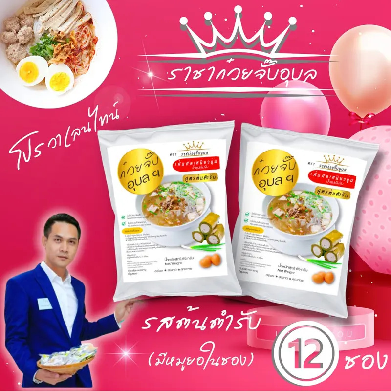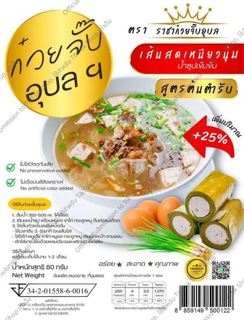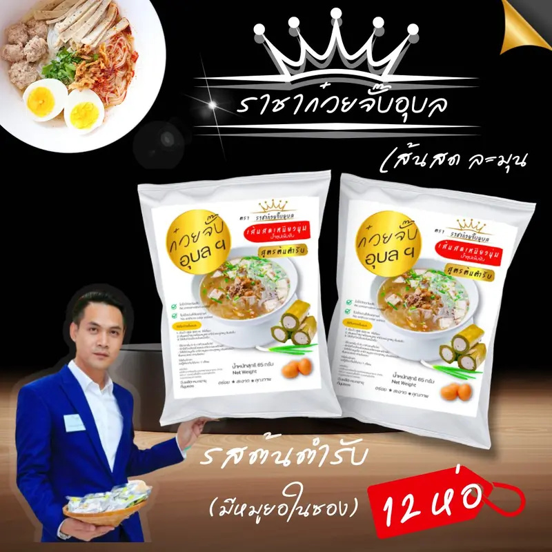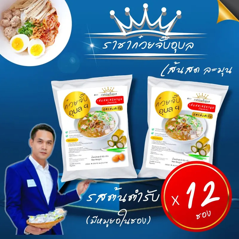 ก๋วยจั๊บอุบล 10 แถม 2 (มียออบกรอบในซอง)สูตรต้นตำรับ เส้นเหนียวนุ่ม เครื่องแน่น สามารถอยู่ในอุณหภูมิห้องได้นานถึง 8 วัน